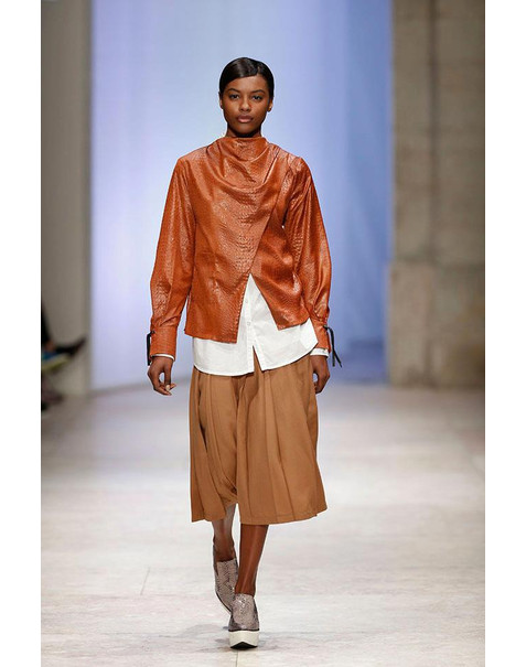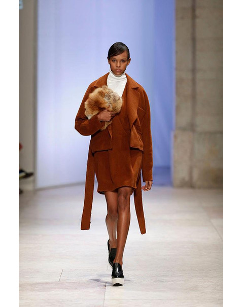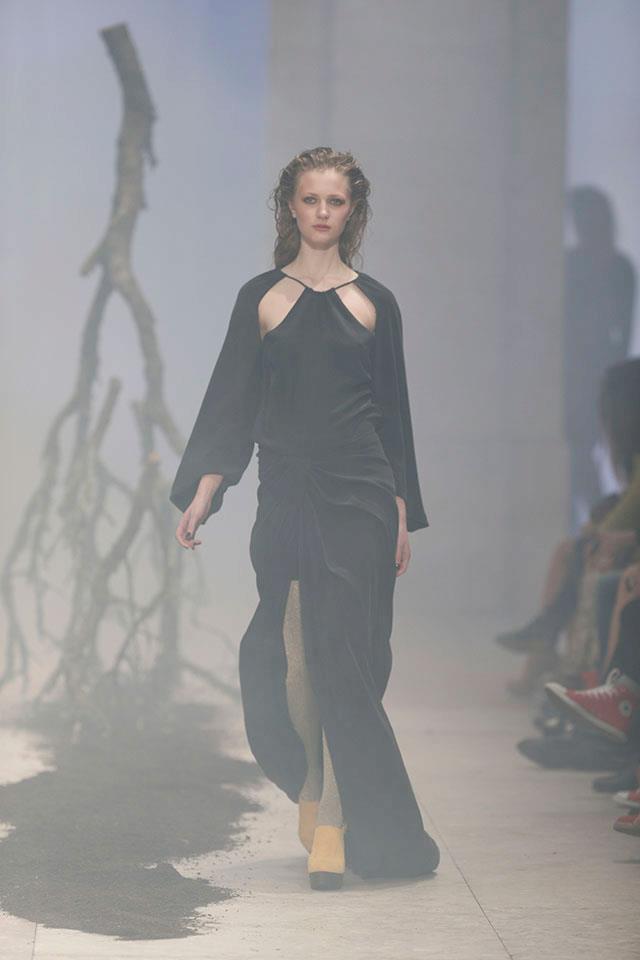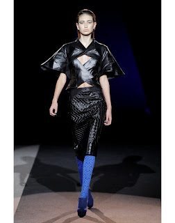 Sempre fiel ao seu estilo gráfico e arquitetural, o preto e o azul marinho mostram-se sempre dominantes ao longo do desfile. Os materiais são diversos passam pela lã, caxemira, couro, camurça, e seda crepe.